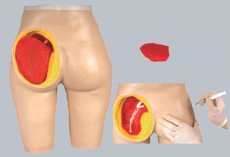产品主要功能: 体表解剖结构准确明了,为更准确的注射操作提供了 科学依据。结构包括:近端股骨、大转子、髂前上棘、 髂后上棘及骶骨。 左臀部外上四分之一可卸下,便于观察确认其内部结构、 臀中肌、臀大肌的肌肉、坐骨神经和血管结构。 可进行三种肌肉注射方法的训练:背侧臀部注射法、腹 侧臀部注射法和骨外侧肌注射法。 材料采用进口塑胶弹性体材料,由不锈钢模具经高温浇 注而成,手感质地真实,经久耐用,进针痕迹不明。